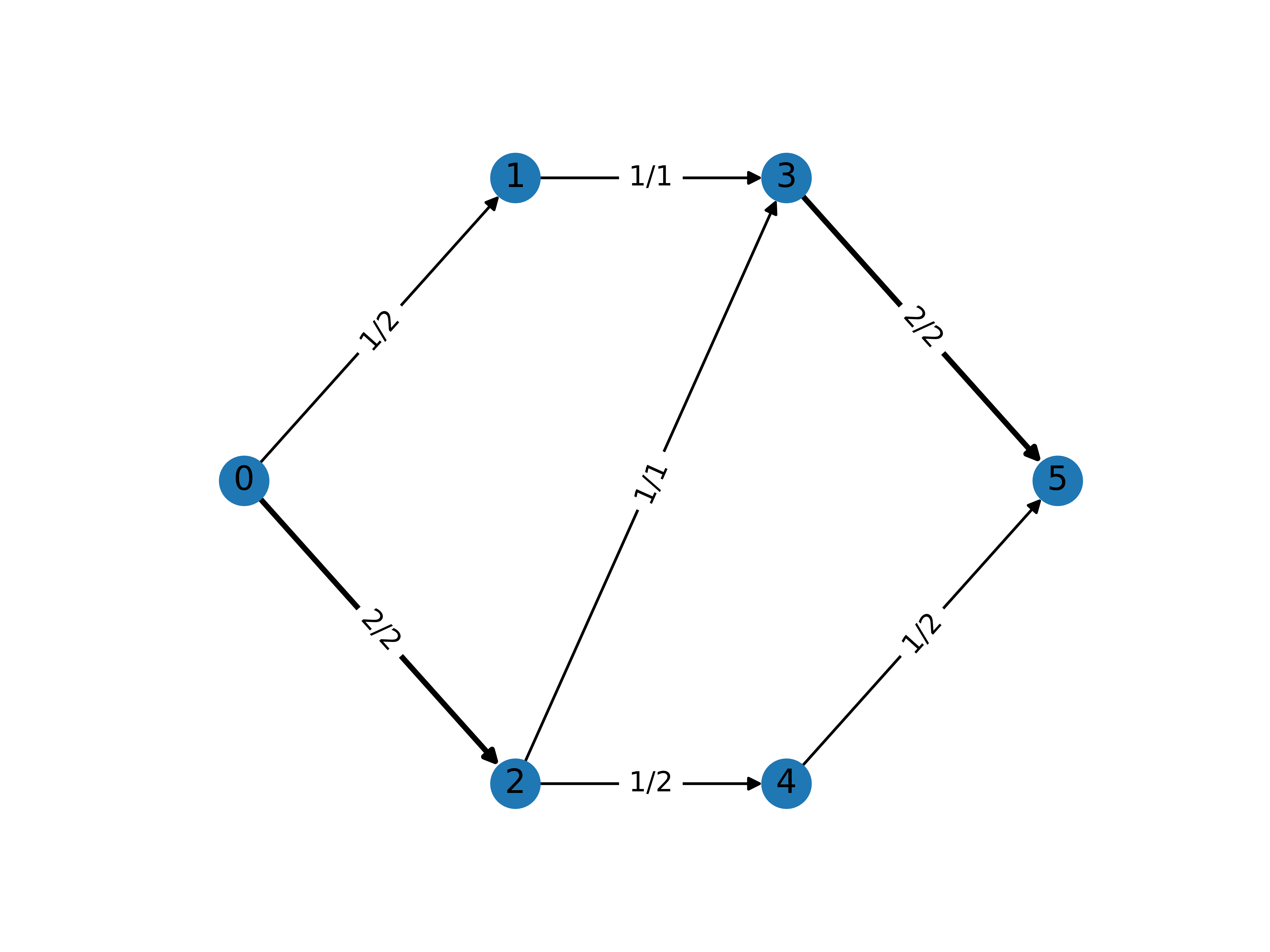 The solution for this example is shown in the figure below. The edge labels denote the edge capacity and resulting flow: \(x^*_{ij}/B_{ij}\). All edges in the maximum flow solution carry some flow, totalling at 3.0 at the sink.