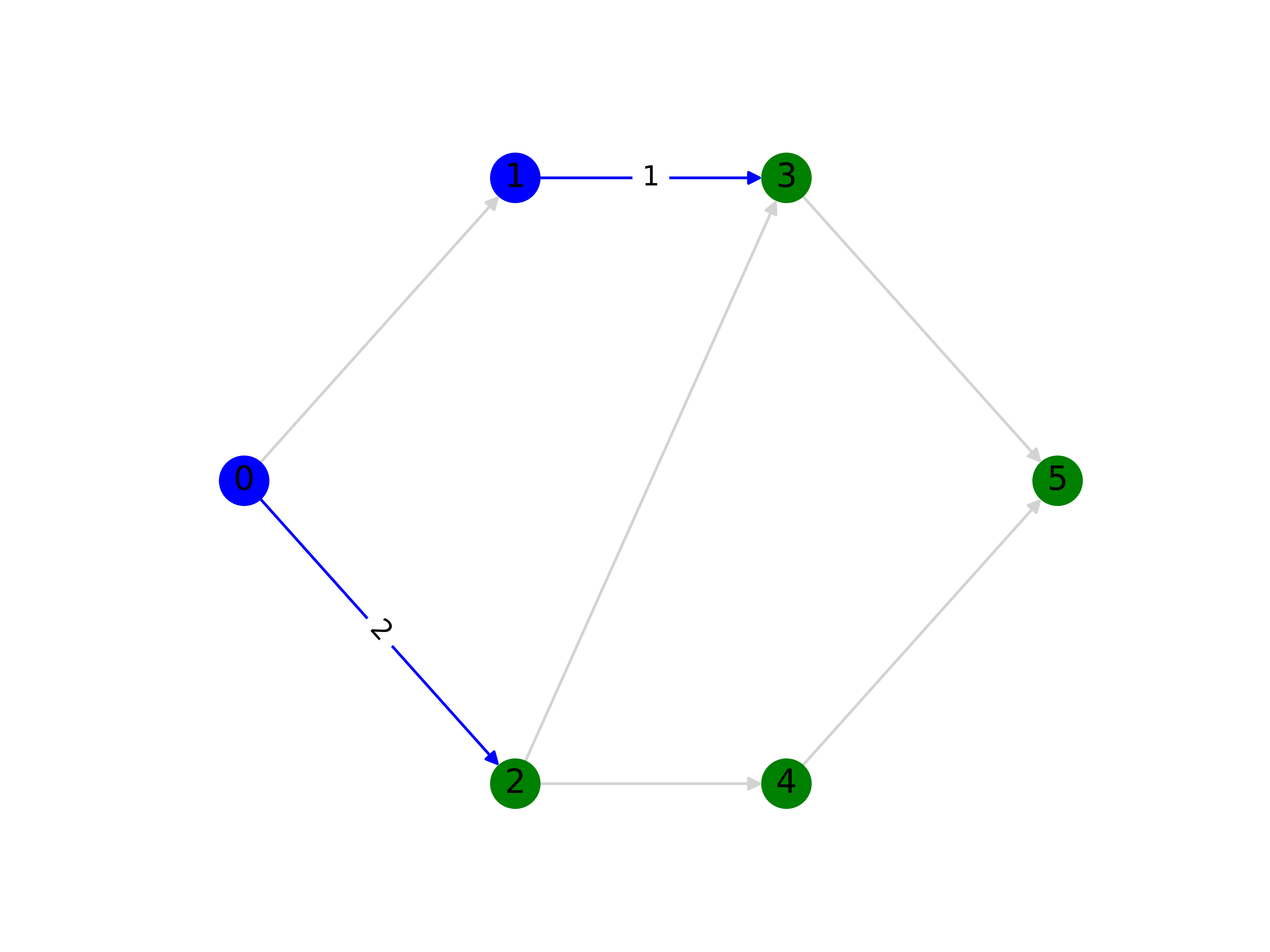 The solution for the minimum cut problem is shown in the figure below. The edges in the cutset are shown in blue (with their capacity values shown), and the nodes in the partitions are shown in blue (nodes 0 and 1) and in green (nodes 2, 3, 4 and 5). The capacity of the minimum cut is \(B_{0,2}+B_{1,3}=2+1=3\) which is also the value of the maximum flow. We can also see that if we remove the blue edges we would be left with a disconnected graph with the two partitions.