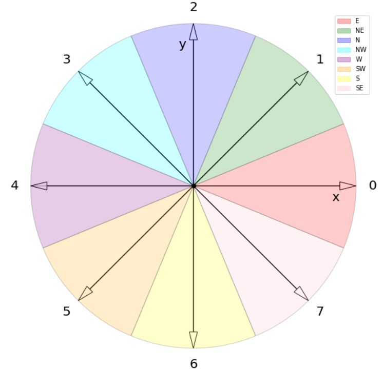 In the octilinear representation, the edge can be drawn in eight different directions when fixing one of its endpoints. Considering the edge \((u,v)\in E\), the node \(v\) can be in the east, north-east, north, north-west, west, south-west, south, or south-east of \(u\). We enumerate these directions from 0 to 7, starting with the east and traversing the directions counter-clockwise. The figure below shows the idea. Assume the node \(u\) is positioned in the center. The edge \((u,v)\) can follow the directions 0 to 7 that represent the cardinal directions.